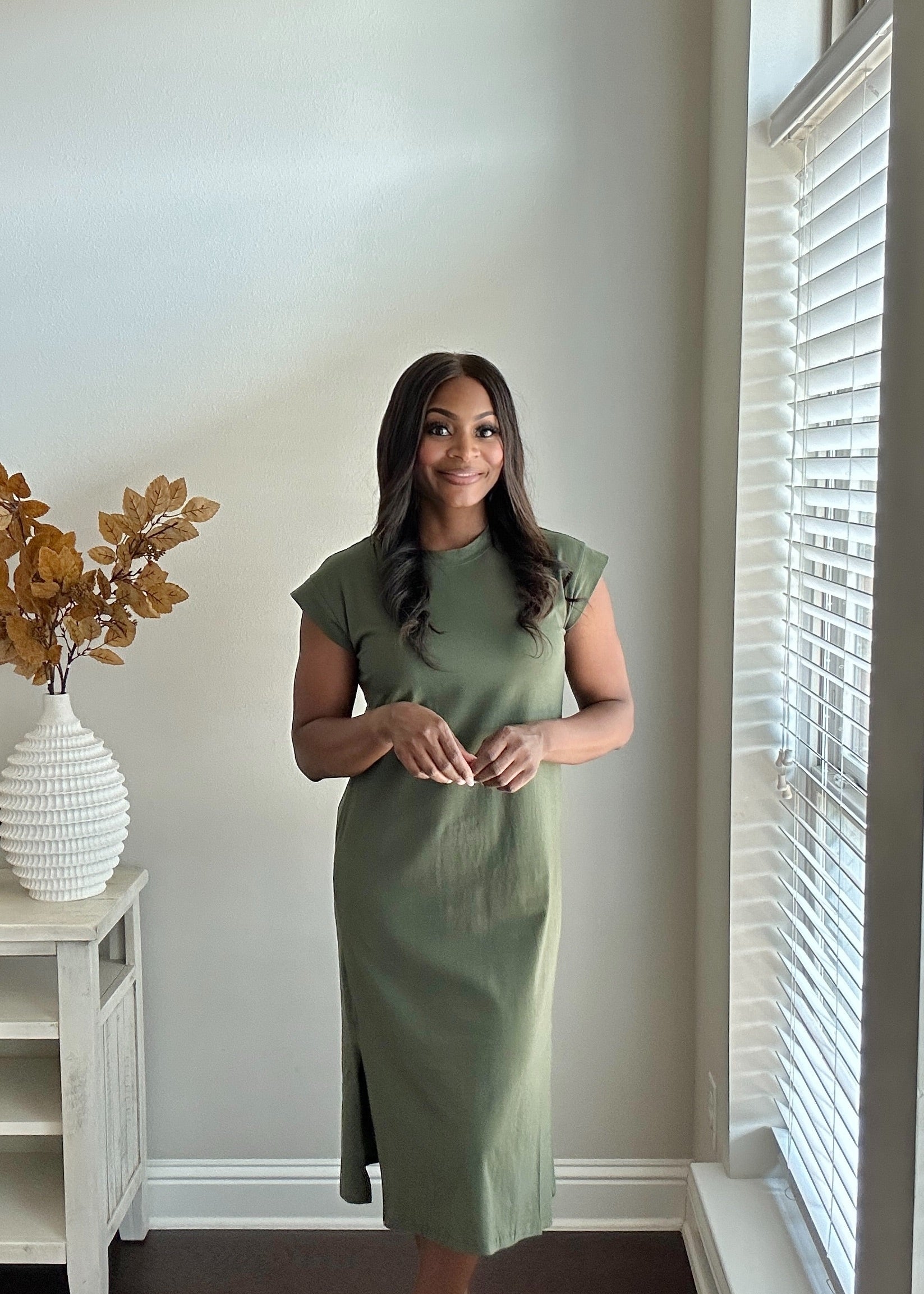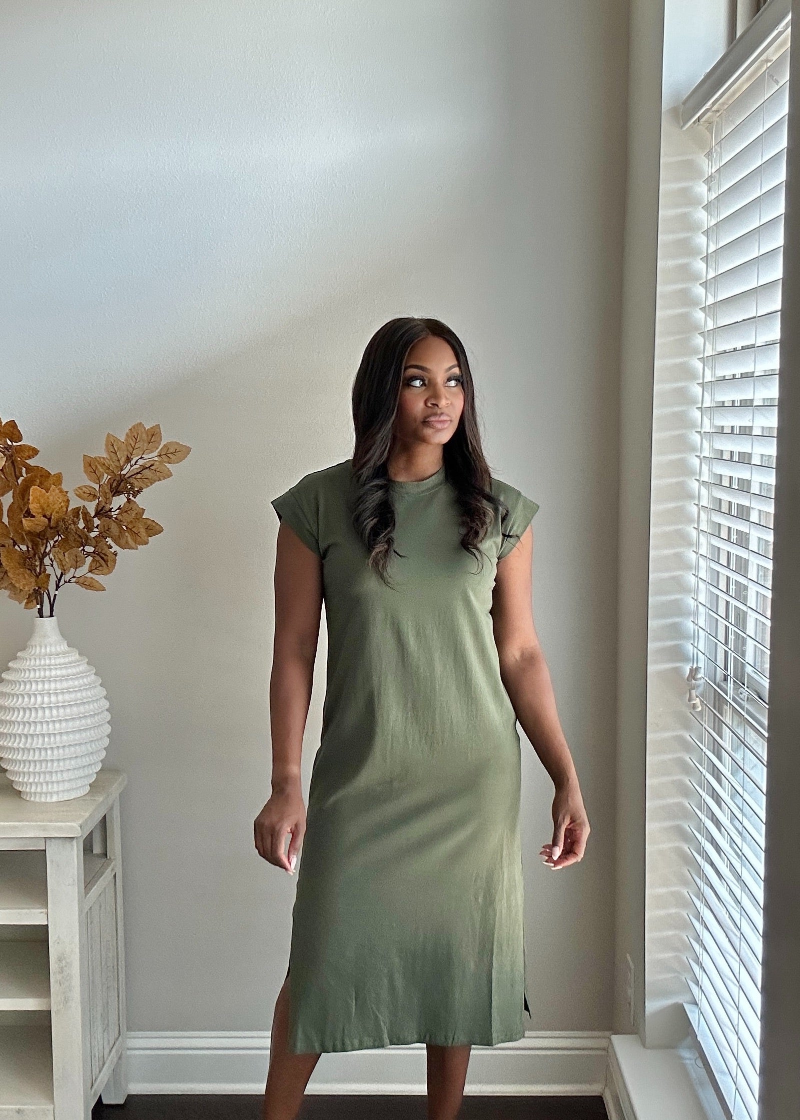 Add a touch of effortless style to your fall wardrobe with The Alani Midi Dress. Featuring a round neck and short sleeves, this midi dress in a rich dark olive color is perfect for the season. Experience comfort and ease without compromising on fashion.