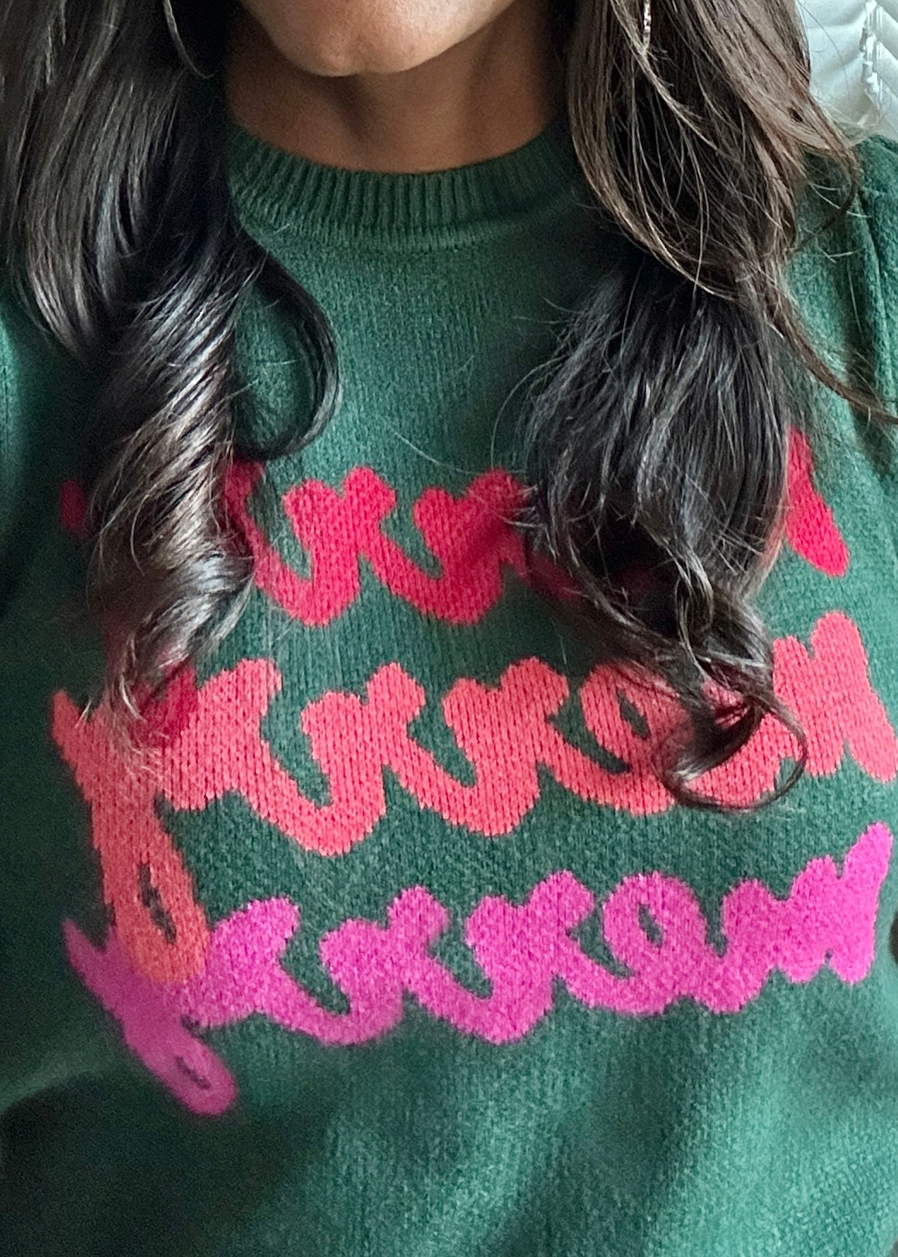 Embrace the season with The Merry Times Three Sweater, showcasing the word "Merry" three times in each of three bright, eye-catching shades. This short-sleeved knit piece merges festive joy with contemporary elegance, crafted from sumptuous soft fabric that invites layering. Whether styled alone or paired with other pieces, it delivers the perfect blend of cheerful spirit and modern sophistication, making it an essential addition to your seasonal collection.