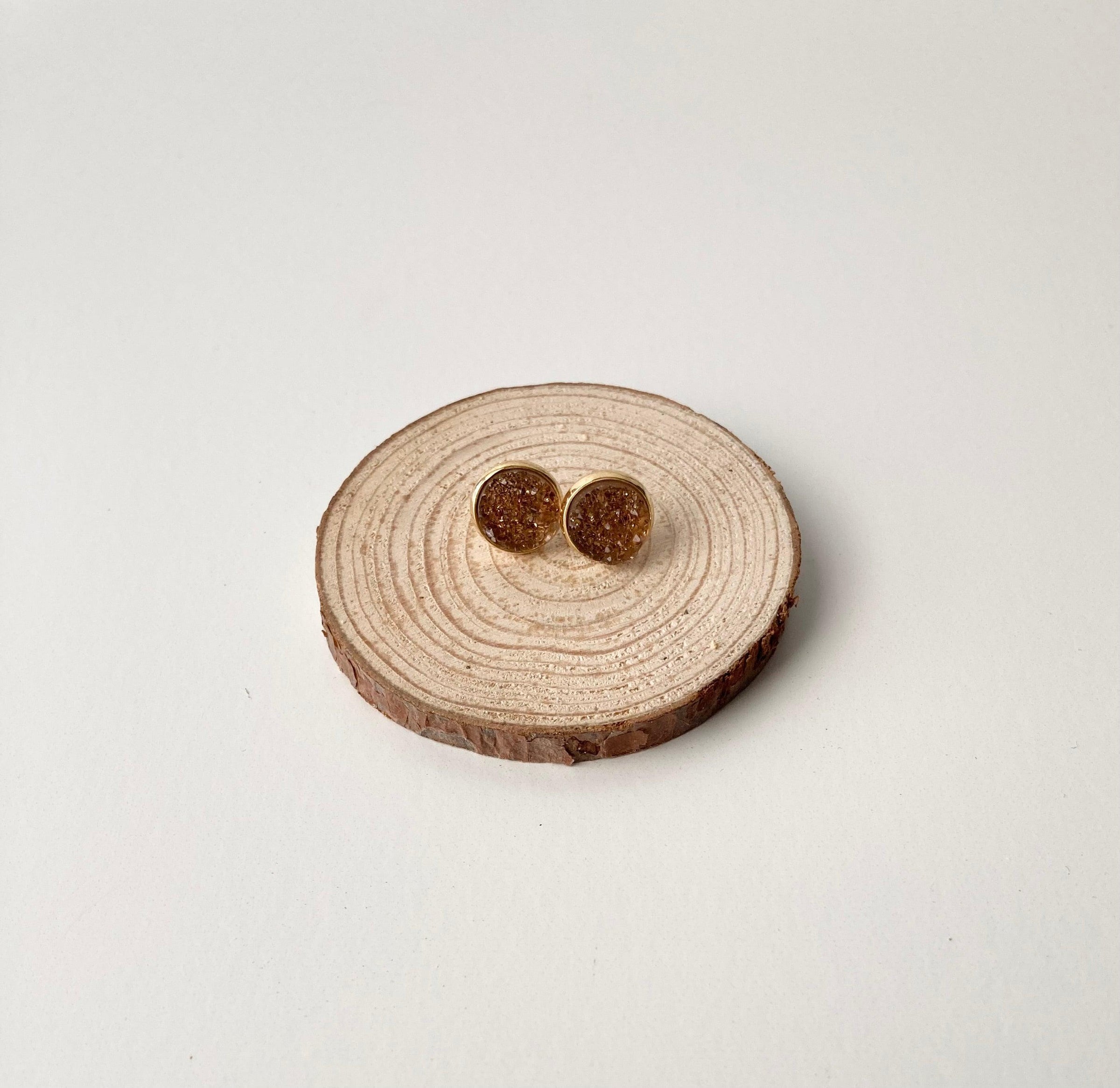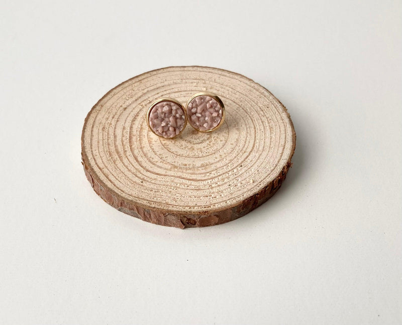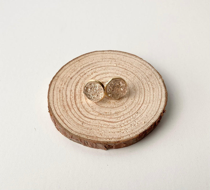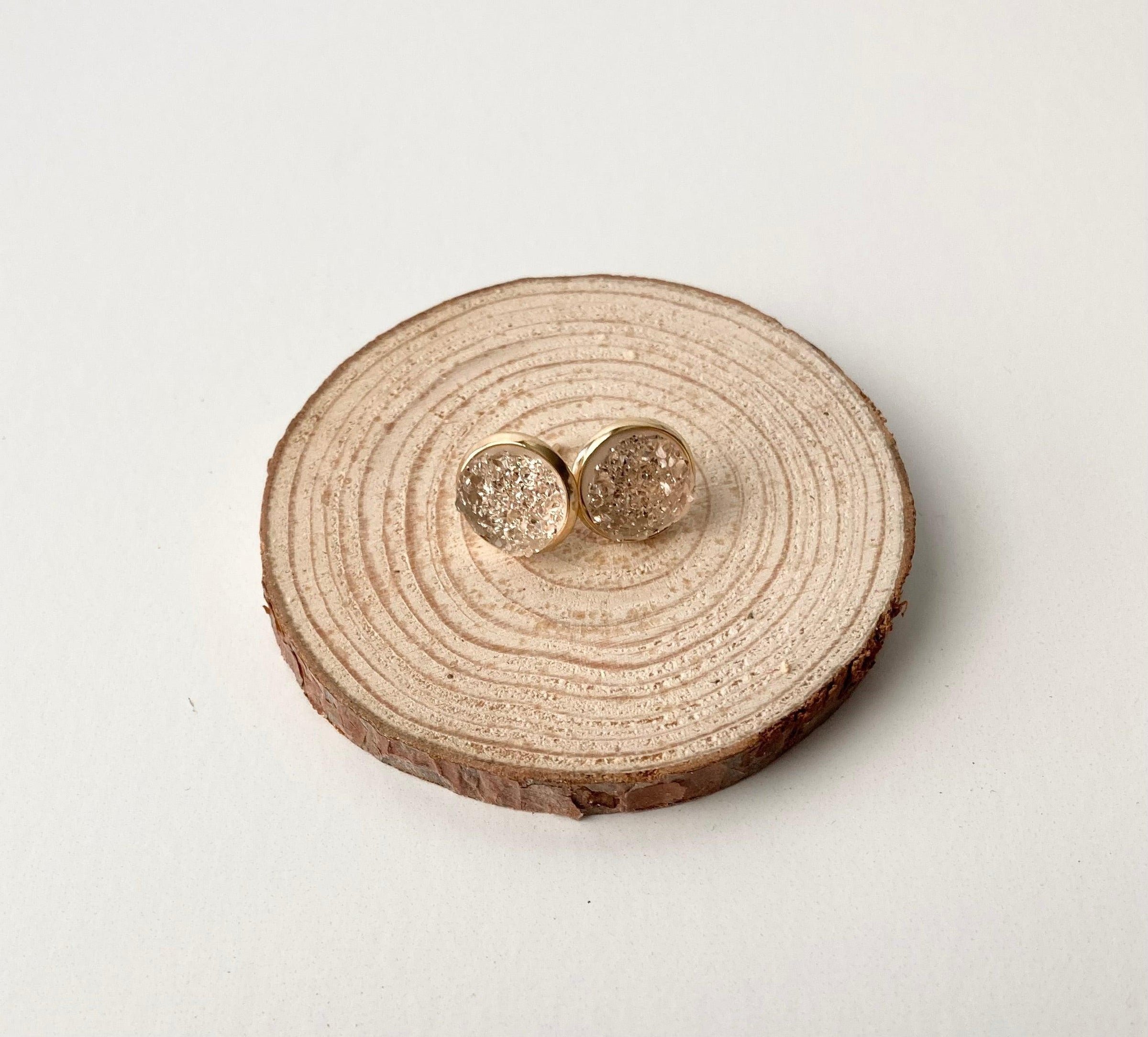 So simple. Yet, so cute. Every girl needs a pair of studs. Druzy quartz is composed of tiny crystals that form on the surface of a stone. These 10mm stud earrings are hypoallergenic stainless steel in gold.