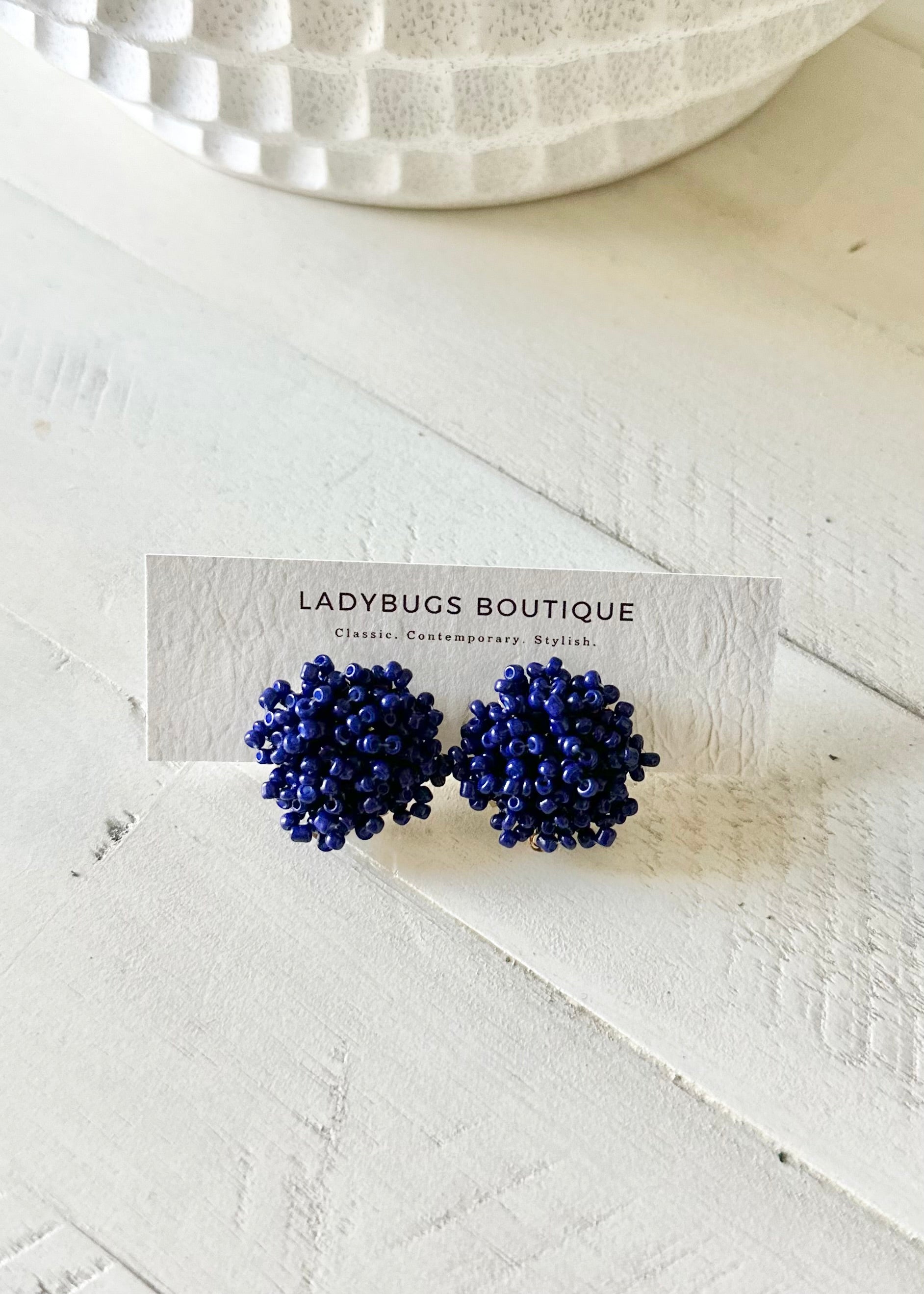 The Beaded Pom Pom Earrings (Navy)