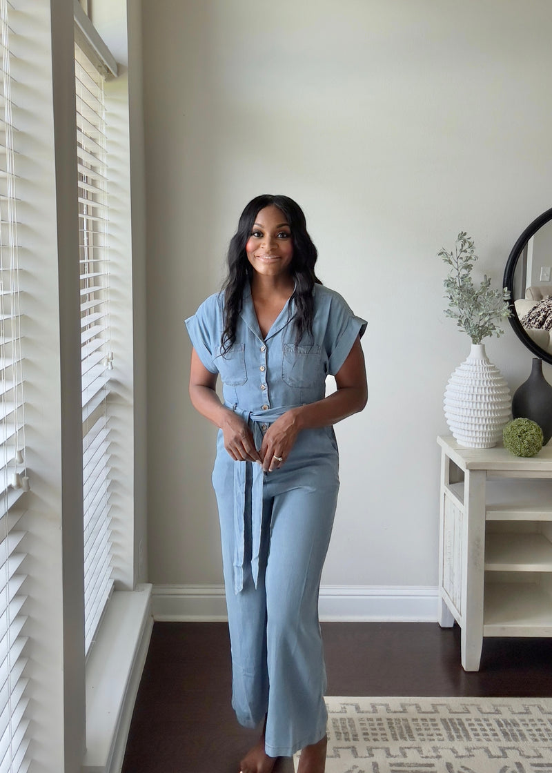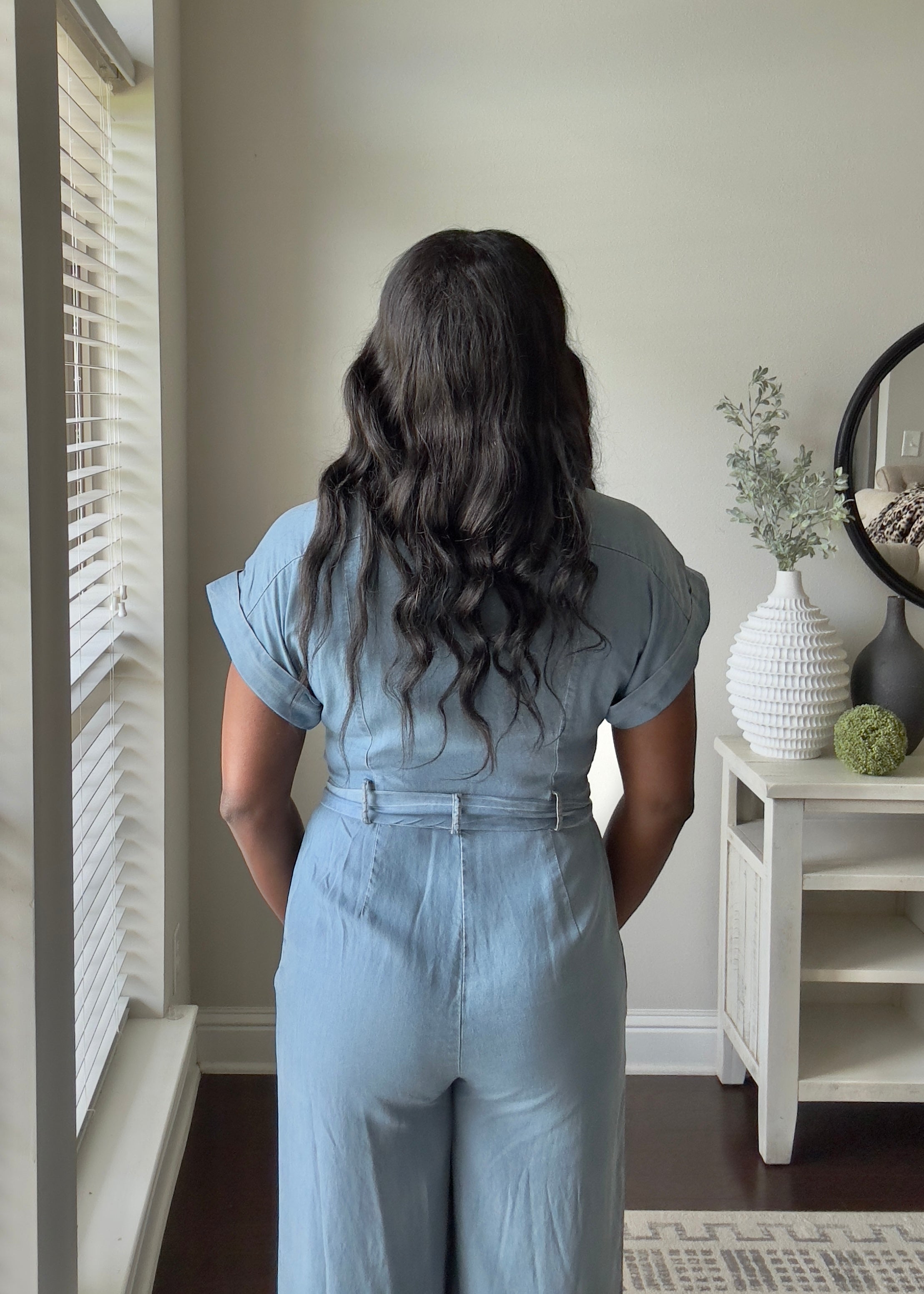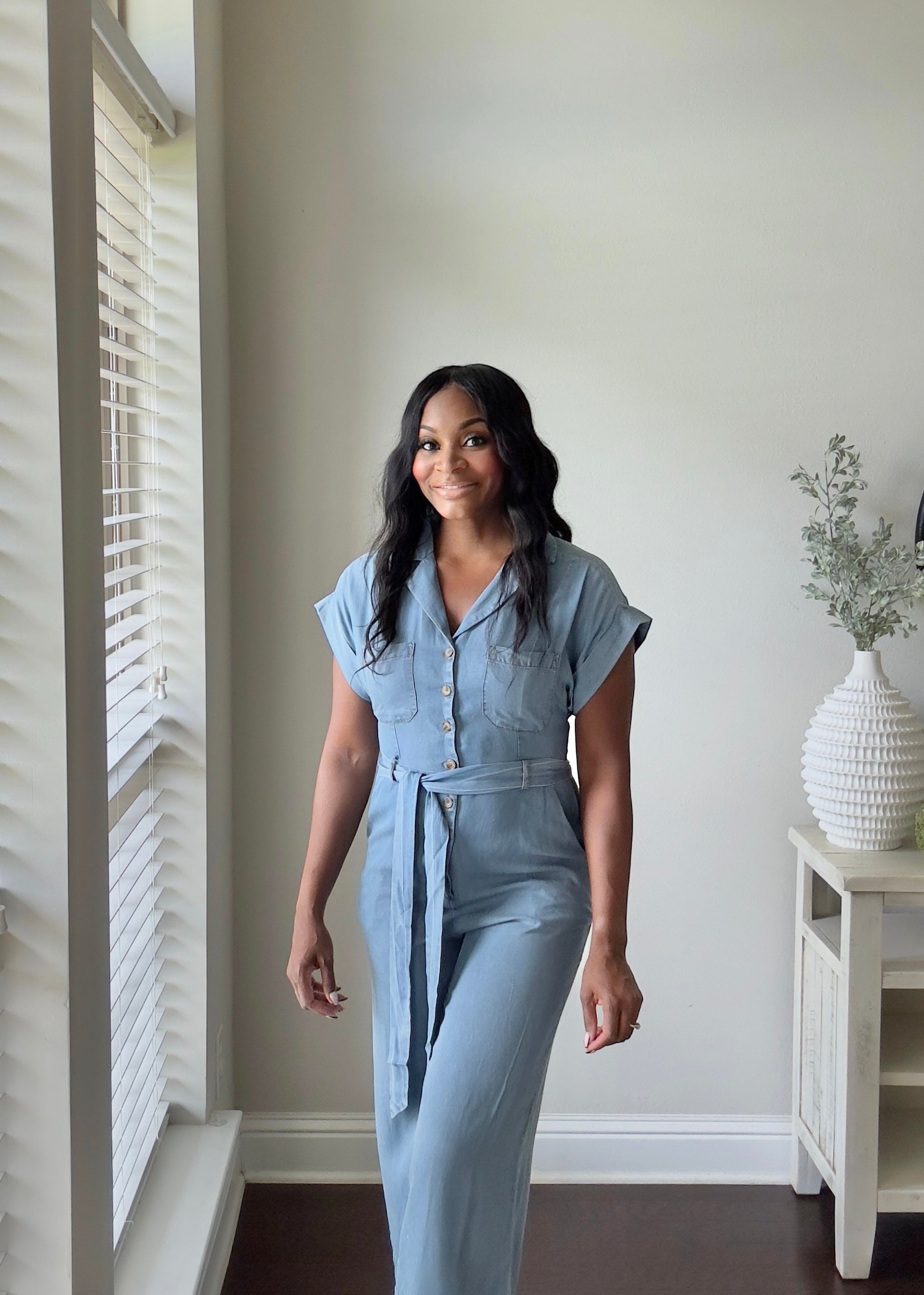 Introducing the Jackie Belted Jumpsuit, a dreamy denim piece that exudes confidence and style. With its relaxed fit and versatile design, this jumpsuit is perfect for any occasion. From brunch with friends to casual dinners or even festival weekends, pair it with sneakers or sandals for an effortlessly chic look. Features a V-neck lapel collar, short sleeves, and front patch pockets for added convenience.