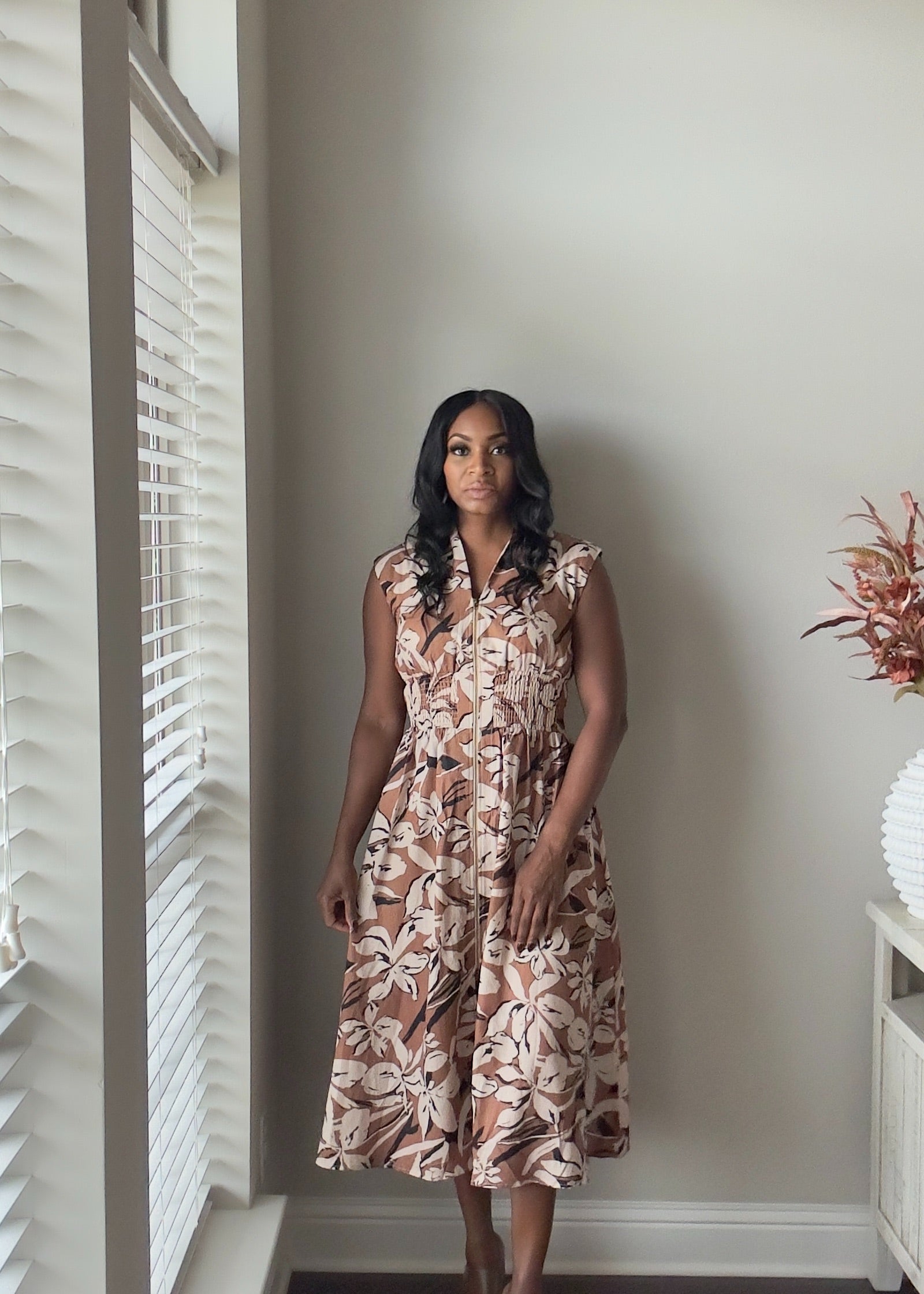 Feel beautiful and confident in The Touch of Caramel Dress. This floral print midi dress features a zip up front, side pockets, and a smocked waist for the perfect fit. Stay comfortable in the lightweight and non-sheer woven fabric. Unlined.